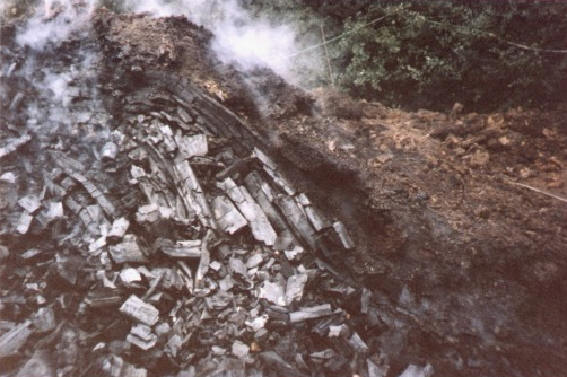Nach ca. 1 – 3 Wochen, je nach Meilergröße, ist der Verschwelungsprozess beendet. Jetzt kann der fertige Meiler mit Hilfe von Ziehhaken oder Störhaken aufgebracht werden. Die fertige Kohle wird mit dem Kohlenrechen aus dem Meiler gezogen und anschließend mit Wasser gelöscht. Nach Abkühlung kann die Kohle verladen werden.